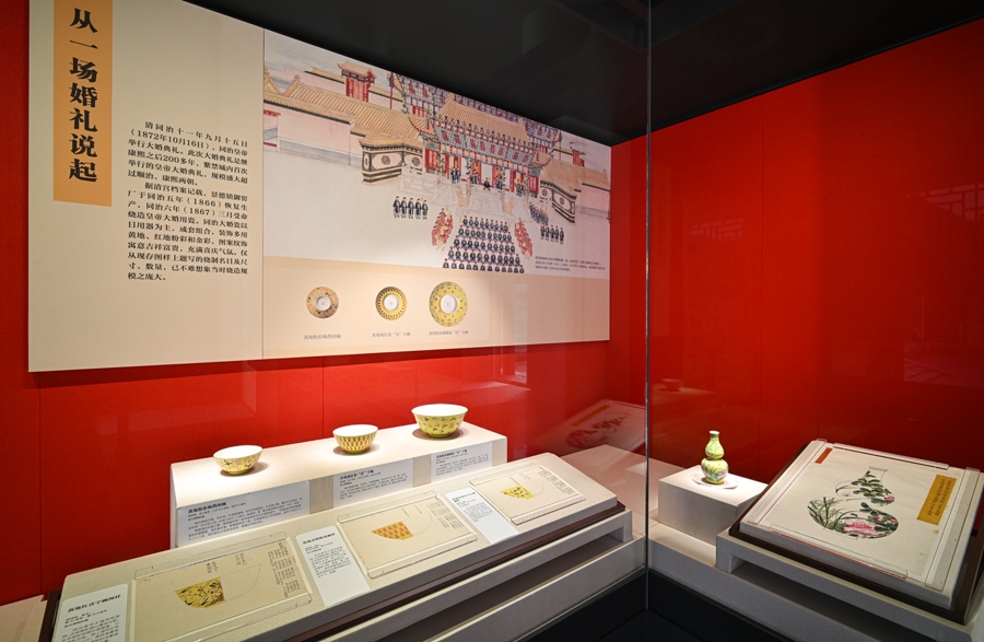 一幅《同治大婚彩棚图轴》设计图样拉开了此单元的序幕,将皇家庆典的规制与气象徐徐展开。紧随其后的,是以同治皇帝大婚瓷、慈禧太后专用瓷为代表的瓷器“画样”。这些绘制精良的设计稿,与最终烧制完成的精美瓷器并置展出,直观展现了从纸面蓝图到实体器物的转化过程。印样、冠样、鞋样、活计样、乃至制作宫廷点心的模子……这些曾经深藏宫闱的各式图样与模具,与它们对应的成品一同呈现,许多均为首次展出。十余组图样、模具与实物的并置,宛如一场跨越百年的“设计成果展”,串联起宫廷生活的雅致与严谨,也让观众得以窥见清代手工业体系严密的设计流程、精湛的生产技艺与独特的审美风格。